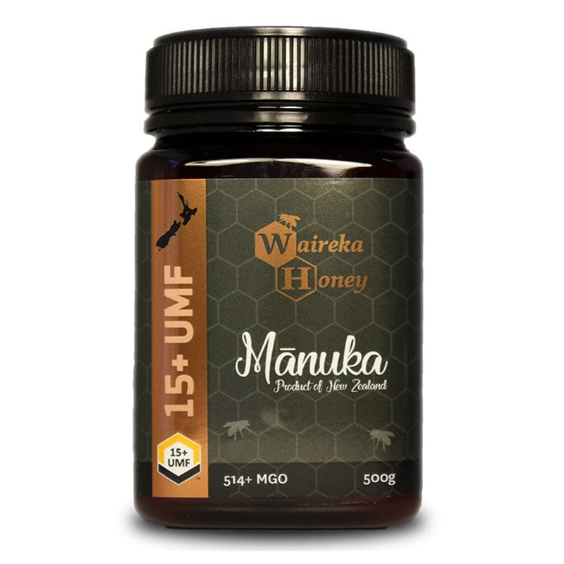 High grade, premium Waireka Manuka Honey UMF™ 15+ is produced in New Zealand by honeybees from the nectar of the native New Zealand Manuka bush (Leptospermum scoparium).
